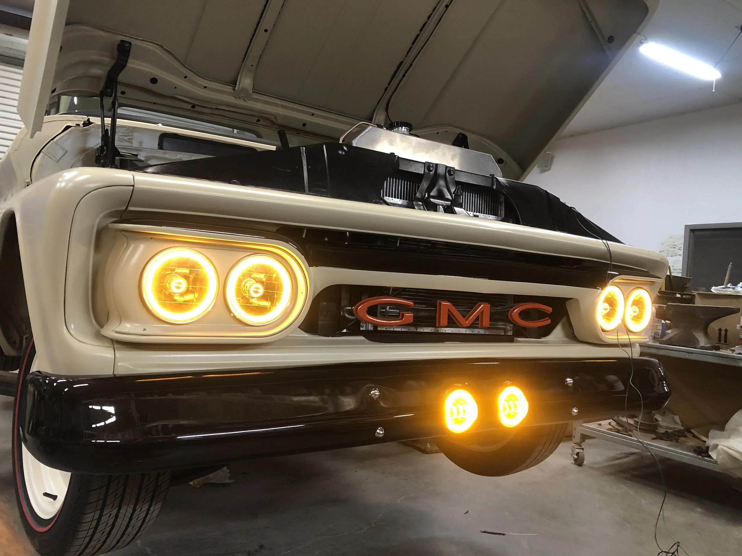 No portfolio would be complete without the classic “for you dad” build. This GMC is Pop’s truck. Built to be a reliable and comfortable driver, this truck is based on a GMT400 C1500 chassis. It even retained the 1989 stepside bed. The “knee knocker” cab and front end are from a ‘61 GMC and the hog-nose hood was swapped out for a ‘63 GMC hood. The 454/TH400 drivetrain was pulled from a motorhome and runs a TBI serpentine drive. The bodylines from the cab were carried back to the bed and fleetside tail lights were grafted into the stepside. A seamless style rollpan keeps the back looking sleek. The center mount halo fog lights in the front bumper were another subtle touch. The 18” smoothies and baby-moon hubcaps finish off the overall look consistent with the intent of modern performance executed with classic styling.